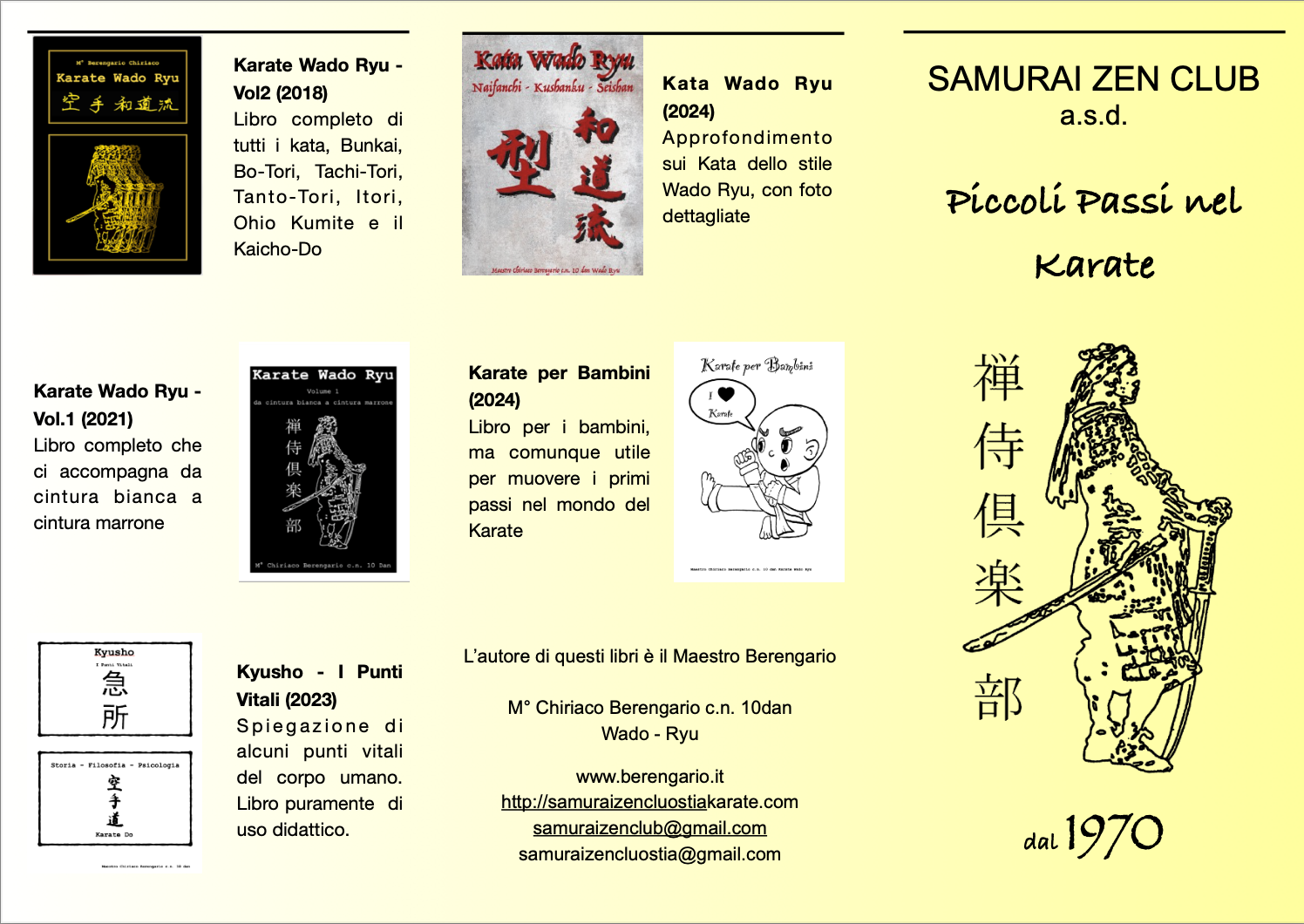 Fin dagli anni Sessanta del secolo scorso, quando è stata fondata, la Samurai Zen Club è un presidio della tradizione, da cui trae la sua forza e i propri valori: rispetto, coraggio, gratitudine, onore e sincerità. È grazie ad essa che in sessantaquattro anni di storia il dojo del Maestro Berengario è stato in grado di coltivare il talento di decine di campioni, che hanno fatto valere la loro tecnica sui tatami internazionali, e di migliaia di allievi di ogni età e condizione, che lì hanno trovato un ambiente in cui crescere sotto molti punti di vista, caratteriale, fisico e culturale. Questo perché il karate insegnato alla Samurai Zen Club non è una mera disciplina sportiva e tantomeno un’attività dopolavoristica o un passatempo per bambini che i genitori non sanno dove parcheggiare, ma un’Arte Marziale e quindi un modo di vivere rivolto all’individuo nel suo complesso. Nella tradizione giapponese, infatti, le arti marziali costituiscono una “via” verso la pace e la felicità. Per raggiungere questo obiettivo non basta imparare la tecnica, men che meno la poca rimasta in quel fenomeno impoverito che è il karate sportivo, ma occorre conciliarla con lo spirito, vale a dire con le virtù etiche e morali all’interno di un percorso di crescita psicofisica e culturale che il praticante è chiamato a intraprendere a qualsiasi età.